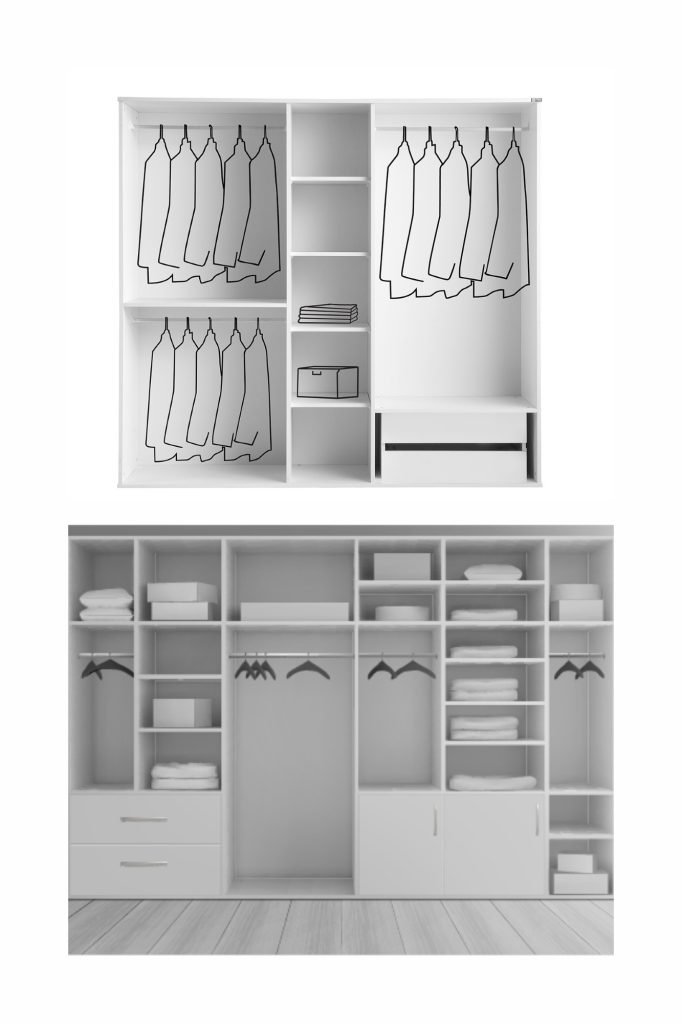 Her gardırop modeli, farklı ölçülerdeki alanlara uygulanabilecek şekilde modüler olarak yapılandırılmıştır.