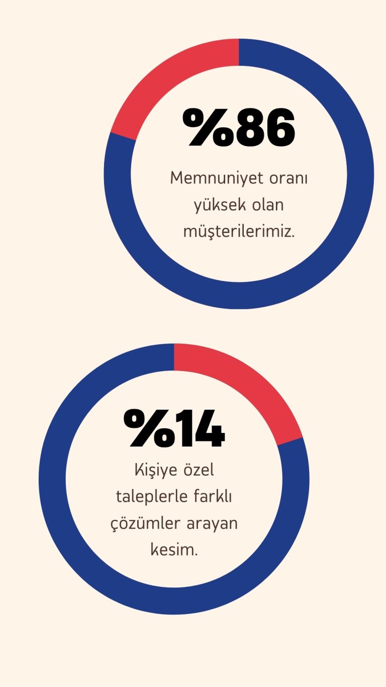 Müşterilerimizin %86’sı, sunduğumuz ürünlerin kalite standartları, dayanıklılığı ve estetik tasarımı açısından yüksek memnuniyet bildirmektedir. Ürünlerimizin uzun ömürlü oluşu ve güven veren yapısı, müşteri sadakatini destekleyen temel unsurlar arasında yer almaktadır.